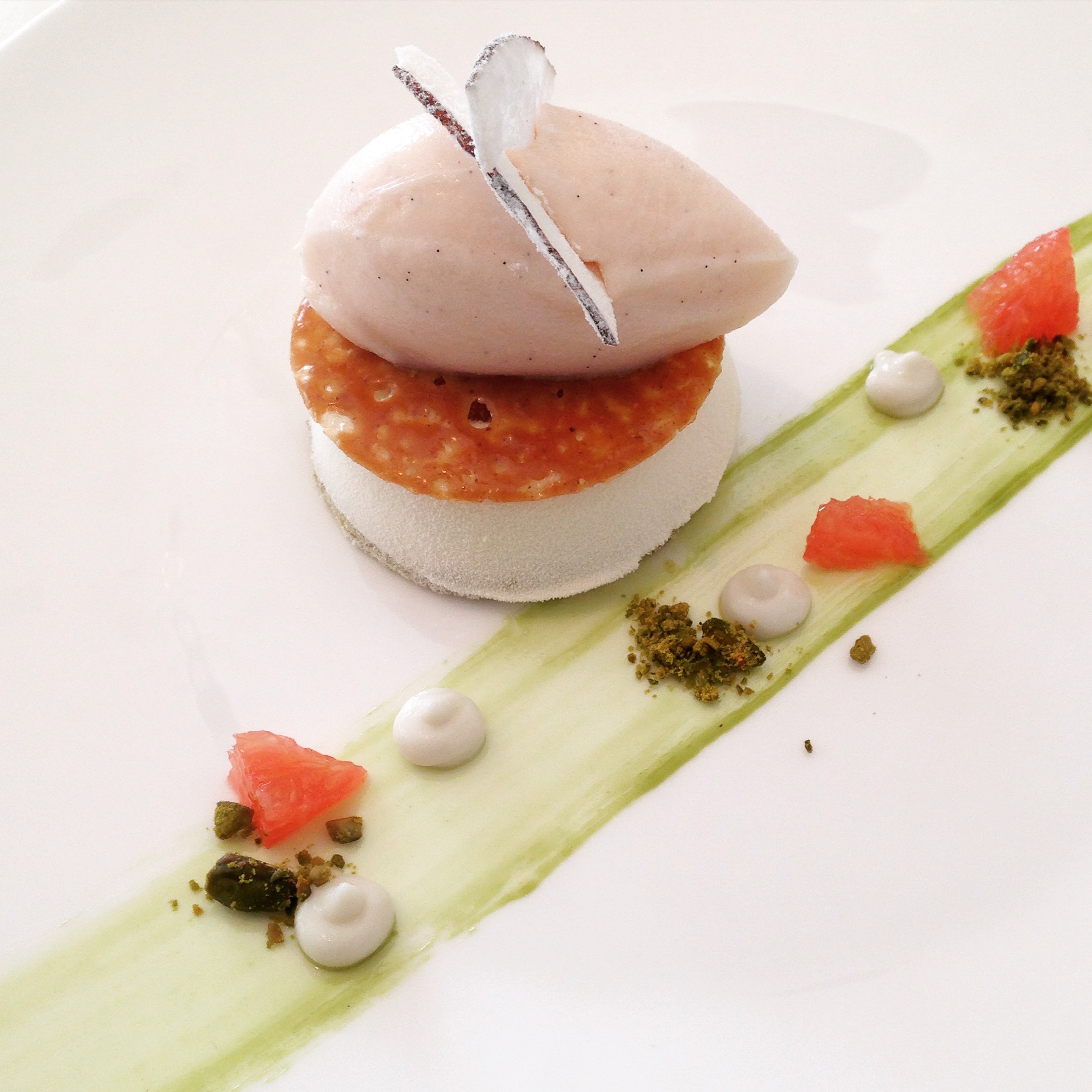 Coconut panna cotta creation, crispy pistachio lace and pink grapefruit sherbet