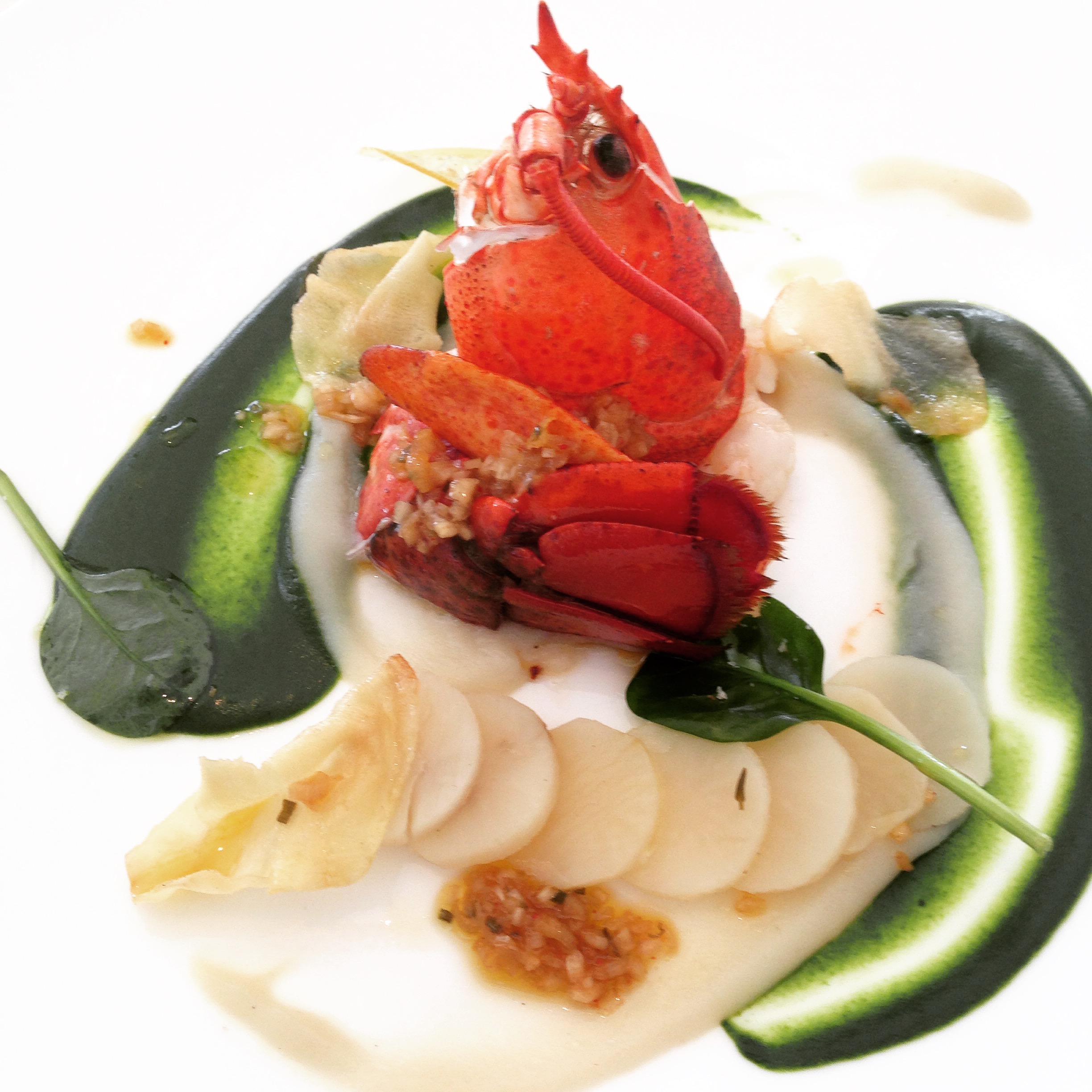 Half lobster roasted with shell ~Winter Trend 2015~ Jerusalem artichokes, spinach and candied lemon.