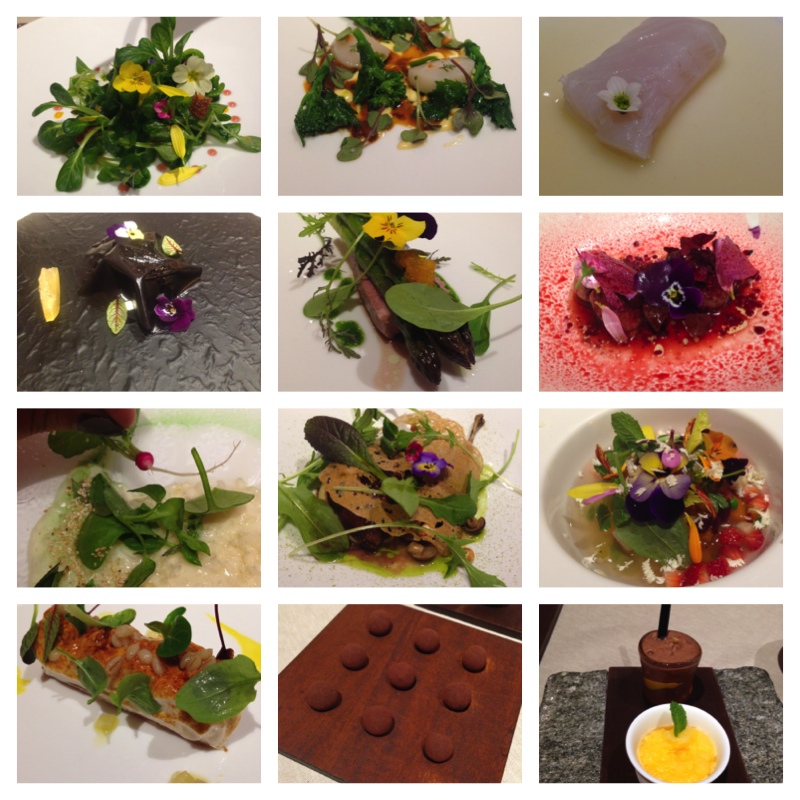 from top left: Spring Salad. Scallops, sea urchins, pecorino.”White”Cod. Squid “Kiefer”